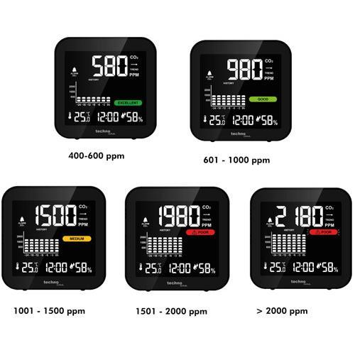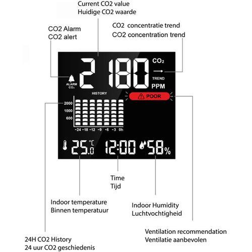 • Duidelijke digitale cijfers met exacte huidige CO2-concentratie in de lucht